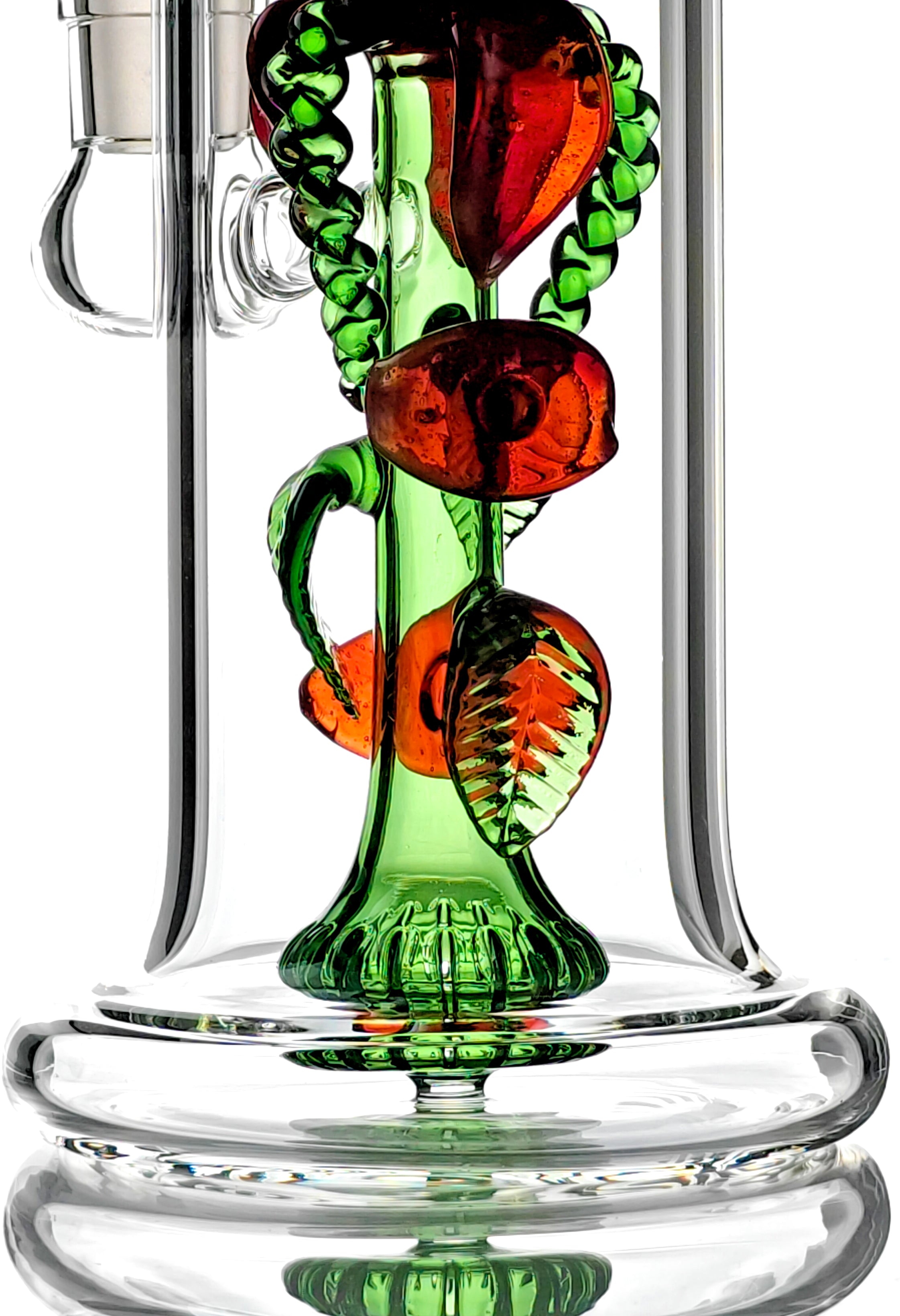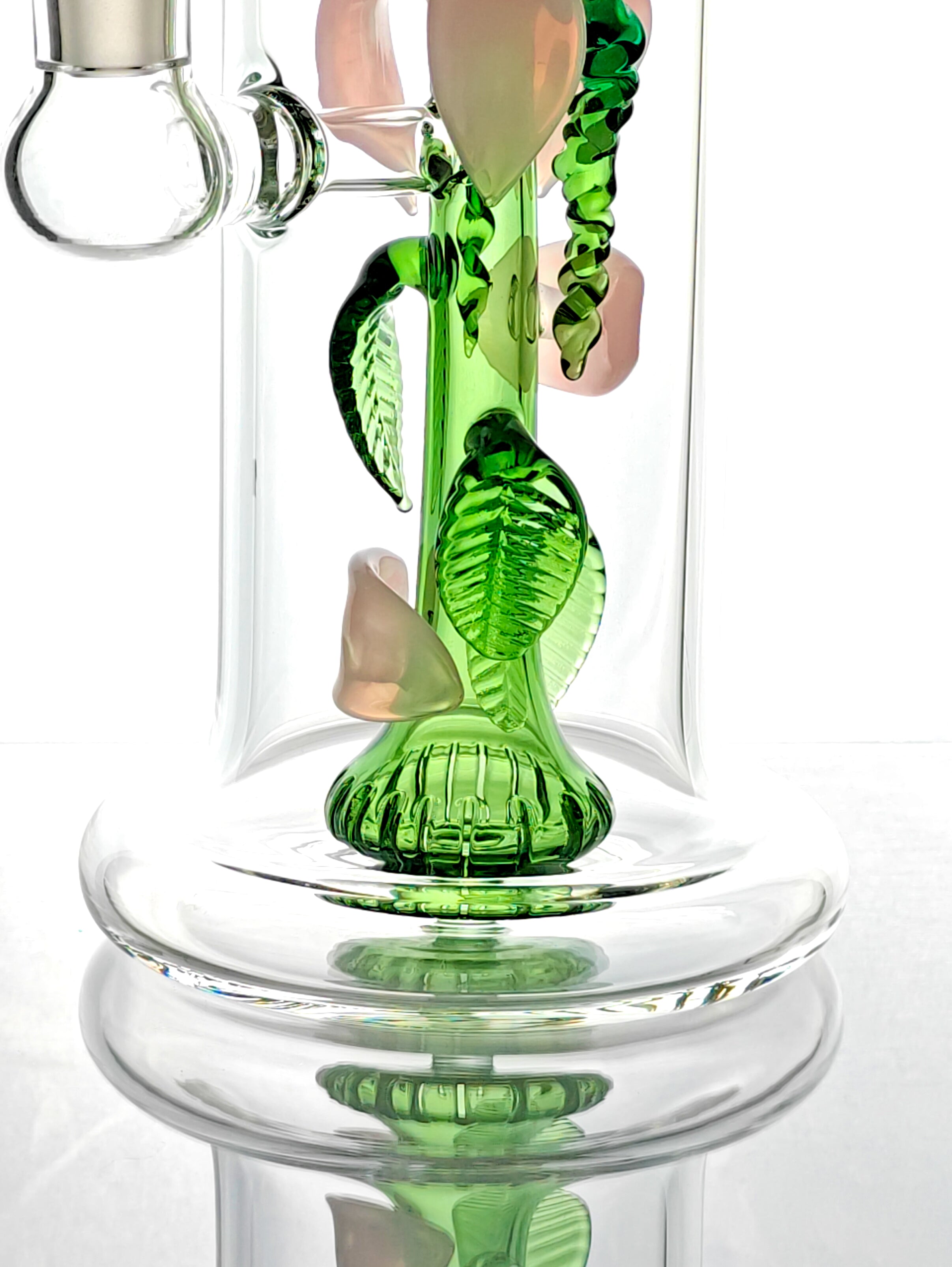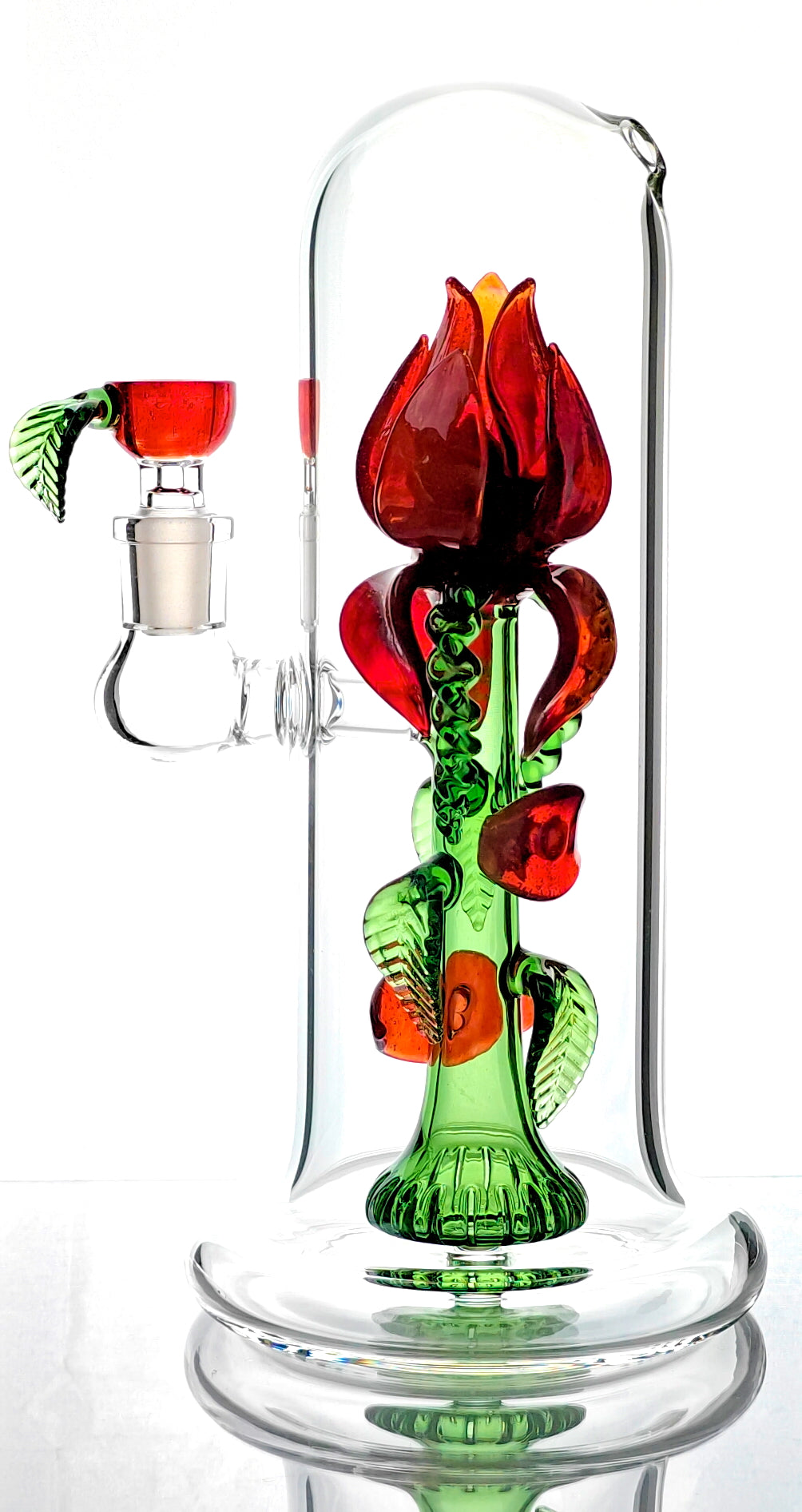This is a cute, beautifully hand-crafted and unique flower vase rig with a rose flower art. It's intricate design includes hand-made rose petals and leaves. The stem is hollow and acts as the showerhead perc! It includes a custom bowl with the same rose flower accents! (14mm male joint)