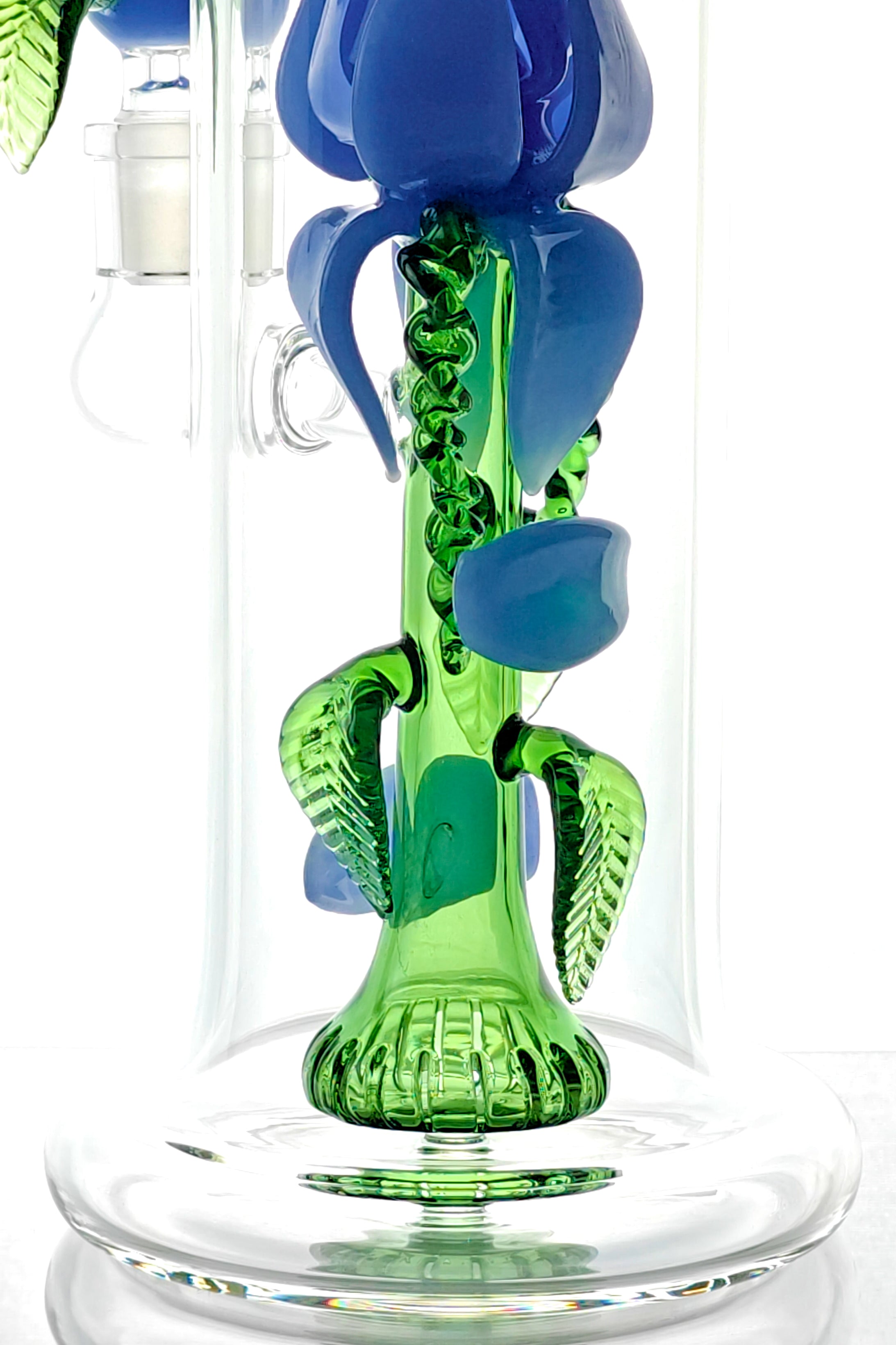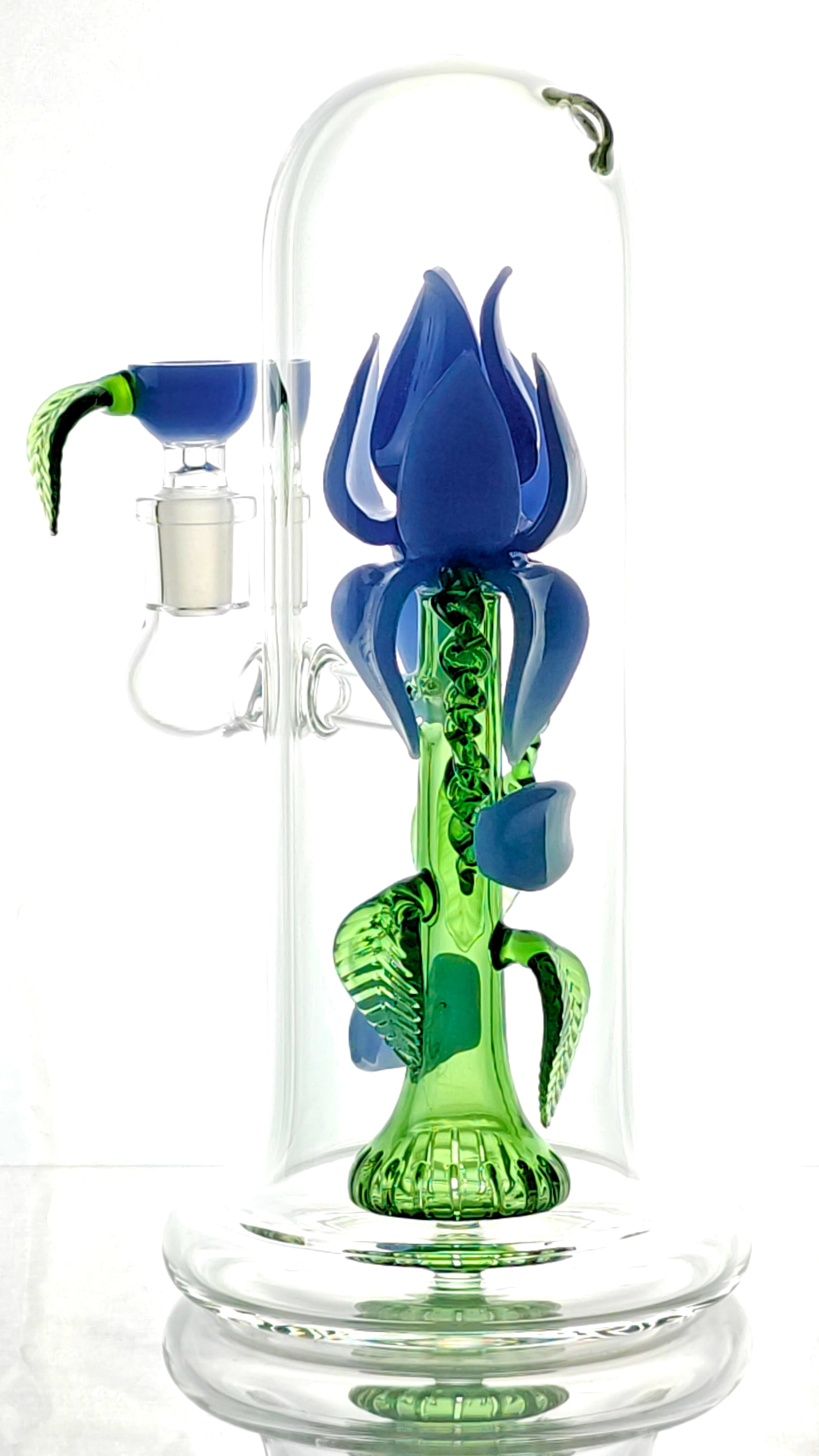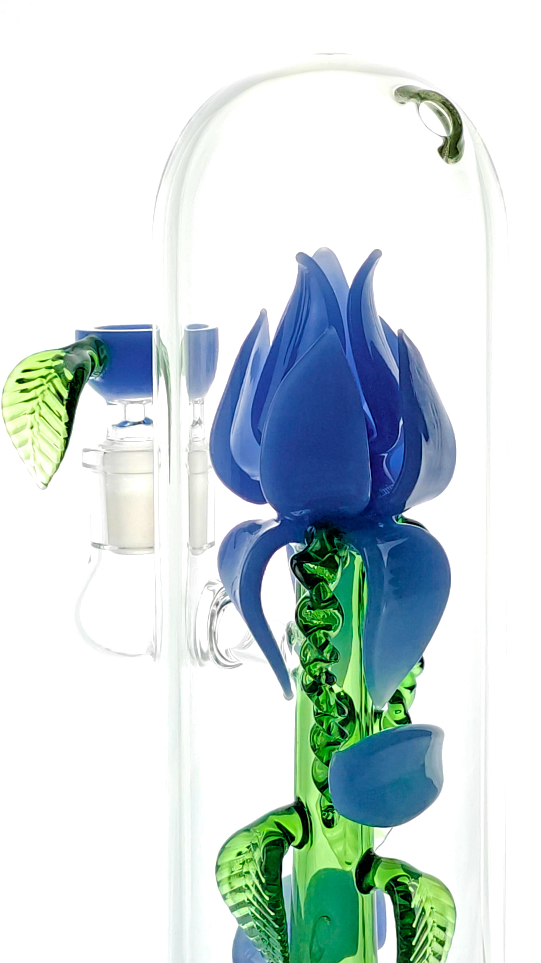 This is a cute, beautifully hand-crafted and unique flower vase rig with a rose flower art. It's intricate design includes hand-made rose petals and leaves. The stem is hollow and acts as the showerhead perc! It includes a custom bowl with the same rose flower accents! (14mm male joint)