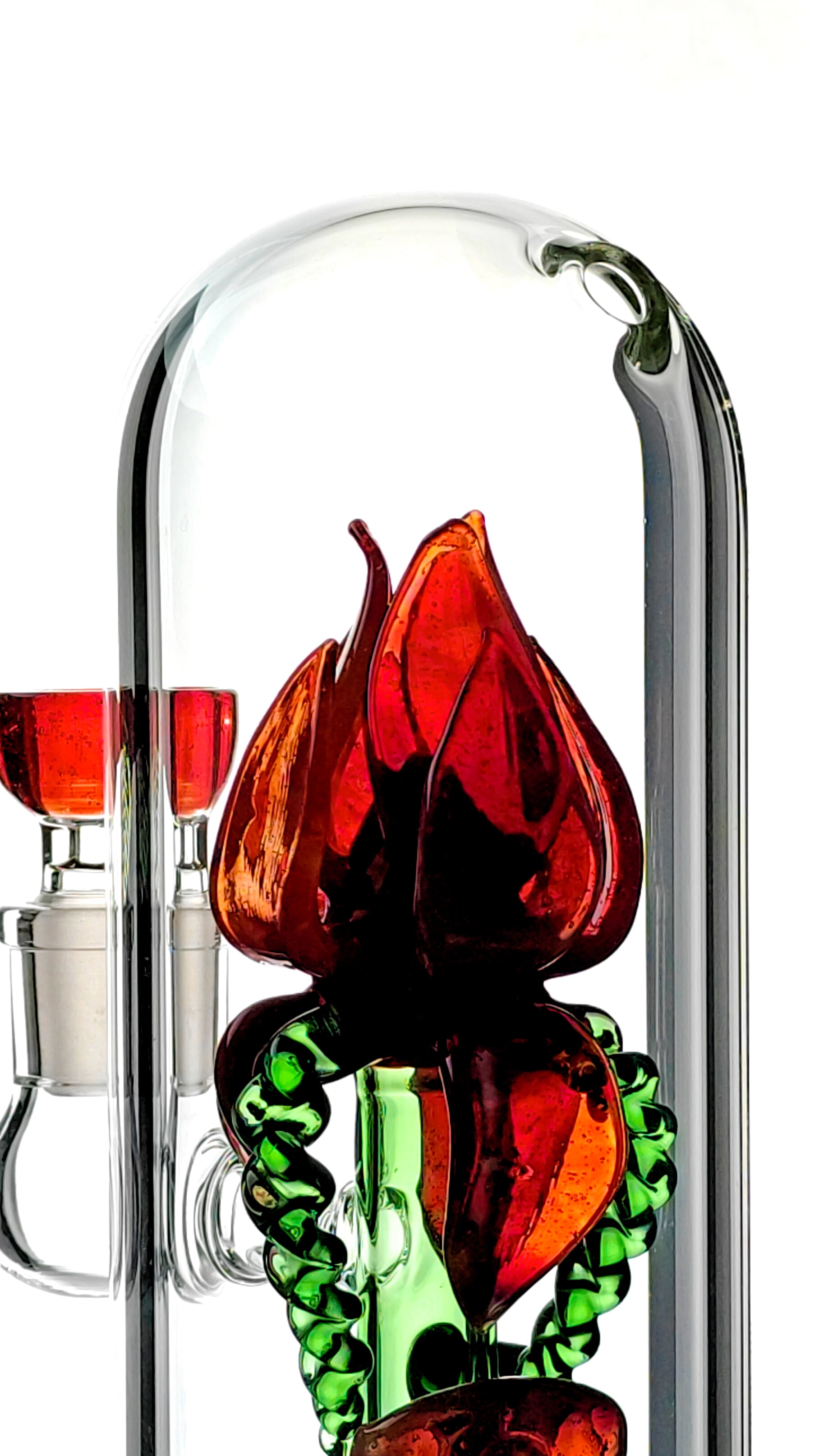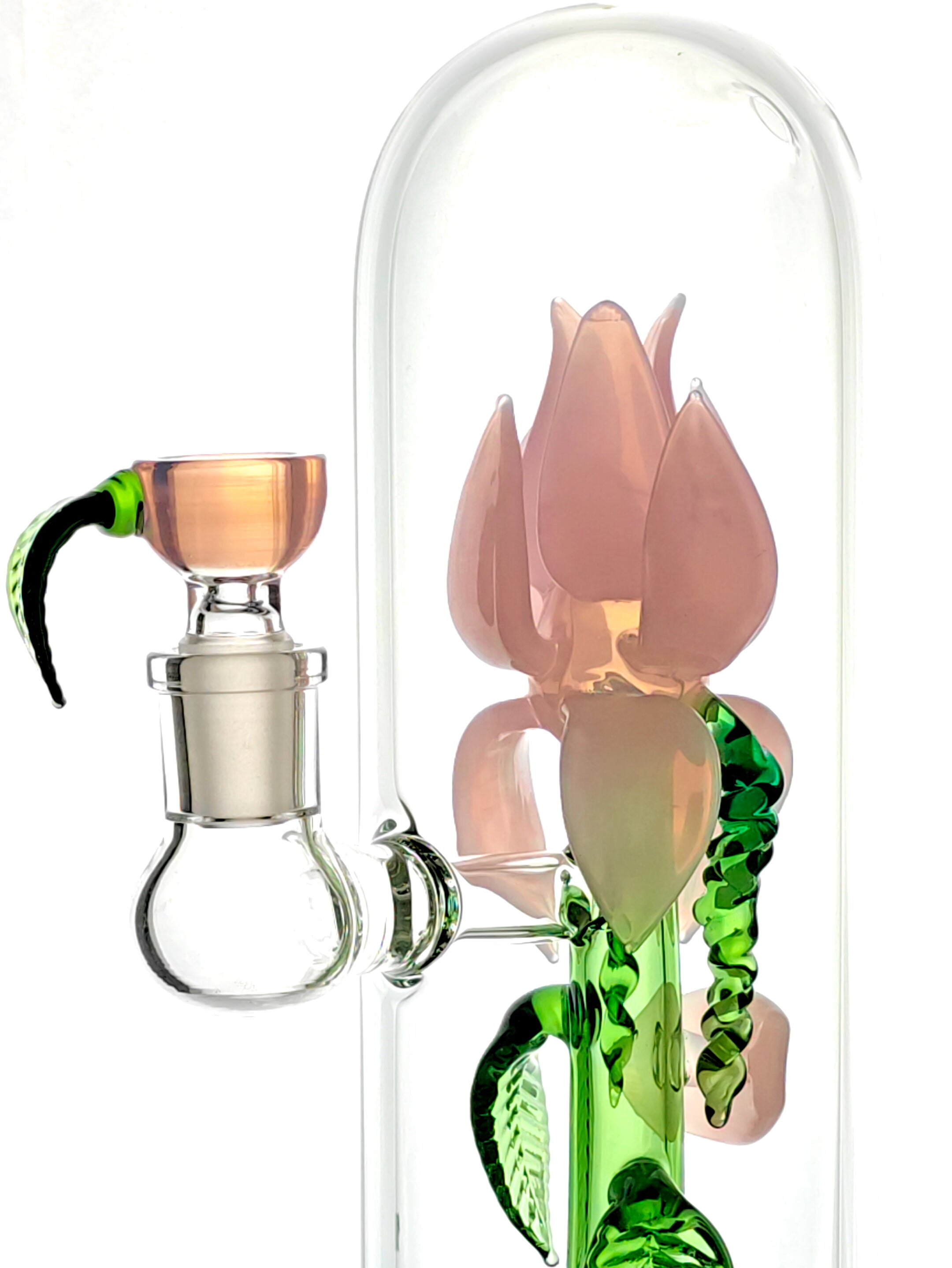 In the hands, it feels heavy with a smooth, clear glass finish. Inside lies the rose flower, complete with pedals, leaves, and a green stem. Looking further down lies the showerhead percolator. It's round shape work to filter and aerate the smoke as it passes through into the chamber, resulting in a smooth hit with great taste.